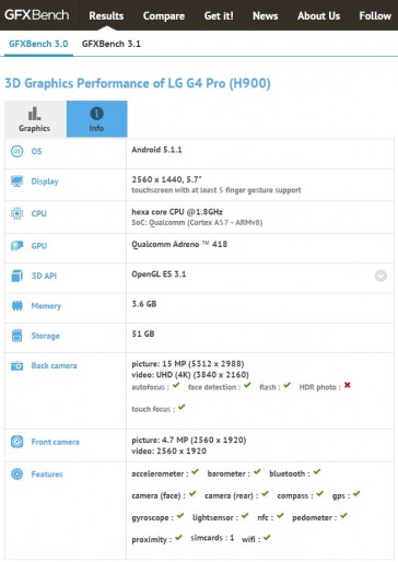 LG’s upcoming smartphone has been leaked again. This time, the device has paid a visit to GFXBench revealing most of its specifications. As per the benchmark listing, the G4 Pro will be powered by a hexa-core Qualcomm Snapdragon 808 chipset clocked at 1.8GHz paired with 3GB of RAM.